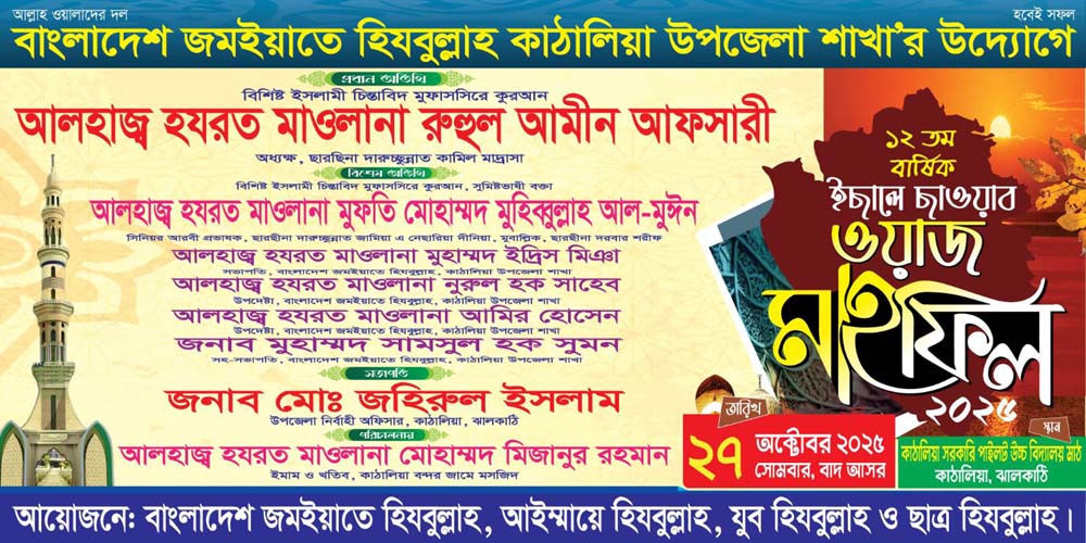 ঝালকাঠির কাঠালিয়া উপজেলার বাংলাদেশ জমইয়তে হিযবুল্লাহ ও সহযোগী সংগঠনের উদ্যোগে আগামী ২৭ অক্টোবর সোমবার আছরের নামাজ বাদ কাঠালিয়া সরকারি পাইলট উচ্চ বিদ্যালয়ের মাঠে ১২তম বার্ষিক ইছালে ছওয়াব ও ওয়াজ মাহফিল অনুষ্ঠিত হবে।