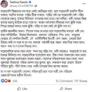 তসলিমা বলেন- সারোগেসি বিজ্ঞানের চমৎকার একটা আবিস্কার বটে। তবে সারোগেসি ততদিন টিকে থাকবে, যতদিন সমাজে দারিদ্র টিকে থাকবে। দারিদ্র নেই তো সারোগেসি নেই। দরিদ্র মেয়েদের জরায়ু টাকার বিনিময়ে ন’মাসের জন্য ভাড়া নেয় ধনীরা। ধনী মেয়েরা কিন্তু তাদের জরায়ু কাউকে ভাড়া দেবে না। কারণ গর্ভাবস্থায় জীবনের নানা ঝুঁকি থাকে, শিশুর জন্মের সময়ও থাকে ঝুঁকি। দরিদ্র না হলে কেউ এই ঝুঁকি নেয় না। গৃহহীন স্বজনহীন কোনও শিশুকে দত্তক নেওয়ার চেয়ে সারোগেসির মাধ্যমে ধনী এবং ব্যস্ত সেলিব্রিটিরা নিজের জিনসমেত একখানা রেডিমেড শিশু চায়। মানুষের ভেতরে এই সেলফিস জিনটি , এই নার্সিসিস্টিক ইগোটি বেশ আছে। এসবের উর্ধে উঠতে কেউ যে পারে না তা নয়, অনেকে গর্ভবতী হতে, সন্তান জন্ম দিতে সক্ষম হলেও সন্তান জন্ম না দেওয়ার সিদ্ধান্ত নেয়।