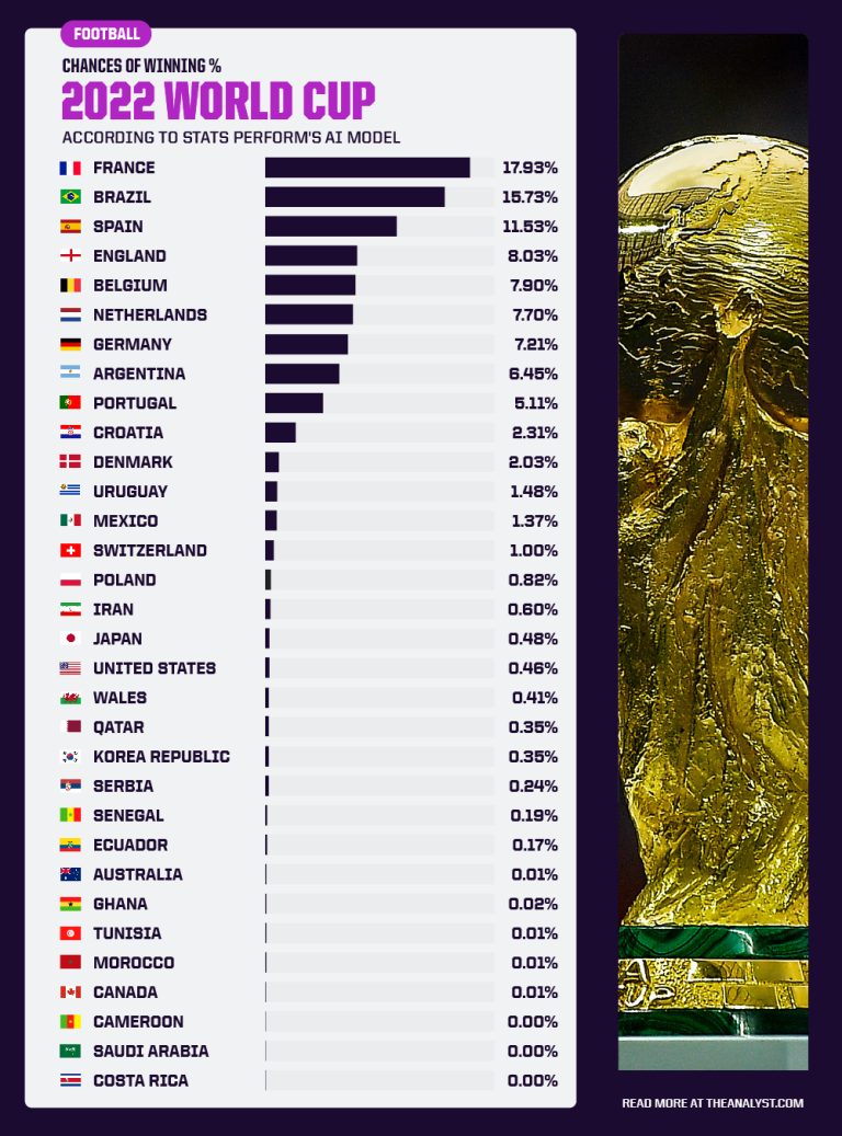 সাম্প্রতিক মাসগুলোর পারফর্ম ভিত্তি করে কাতার বিশ্বকাপকে কেন্দ্র করে গ্লোবাল র্যাঙ্কিং মডেল তৈরি করেছে অপটা স্পোর্টস। যা অপটা স্পোর্টস ডাটা নামেও পরিচিত। ব্রিটিশ এই স্পোর্টস অ্যানালিটিক্যাল কোম্পানিটির প্রণিত র্যাঙ্কিং মডেলে বর্তমান চ্যাম্পিয়ন ফ্রান্স এবং রেকর্ড চ্যাম্পিয়নধারী ব্রাজিল দুই দলই শীর্ষস্থান ধরে রেখেছে।